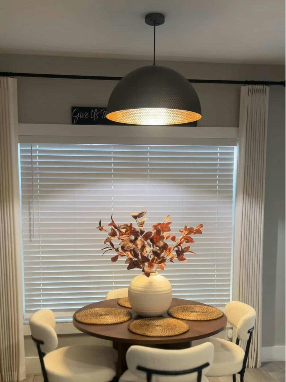 I hung this pendant above my dining table, and it immediately made the whole space feel so warm and inviting. The glow is soft but focused, perfect for cozy dinners. The hammered texture looks gorgeous in person—such a simple change but it made a big difference in the room.