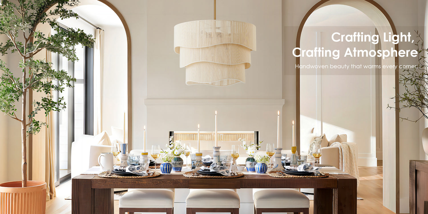 ‧ 𝐁𝐨𝐡𝐞𝐦𝐢𝐚𝐧 𝐀𝐦𝐛𝐢𝐚𝐧𝐜𝐞: Layered fabric shades diffuse a warm, ambient glow, adding texture and depth—ideal for infusing living rooms, bedrooms, or dining spaces with cozy, bohemian charm.