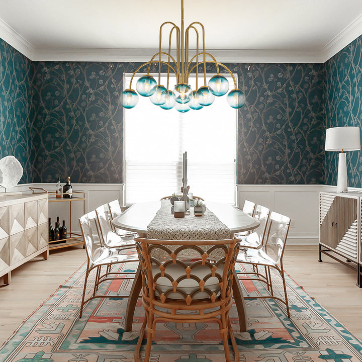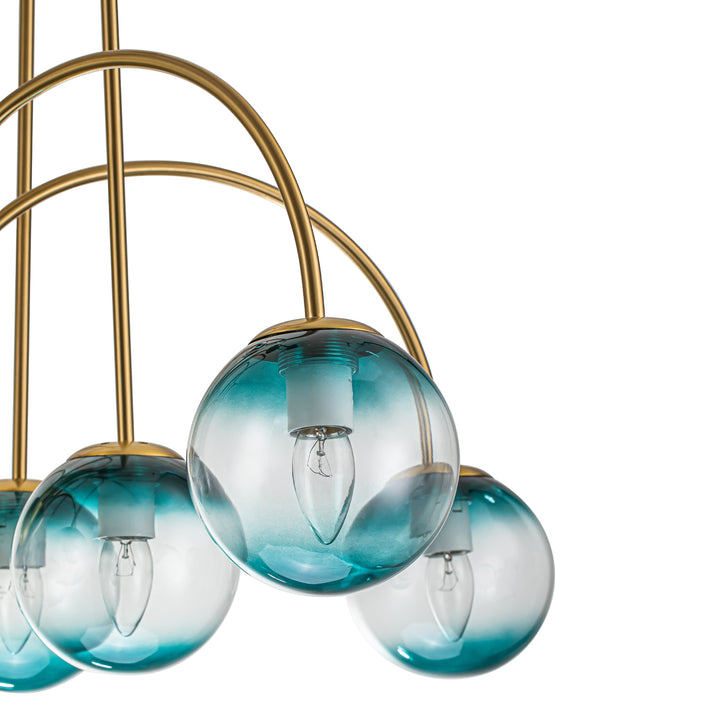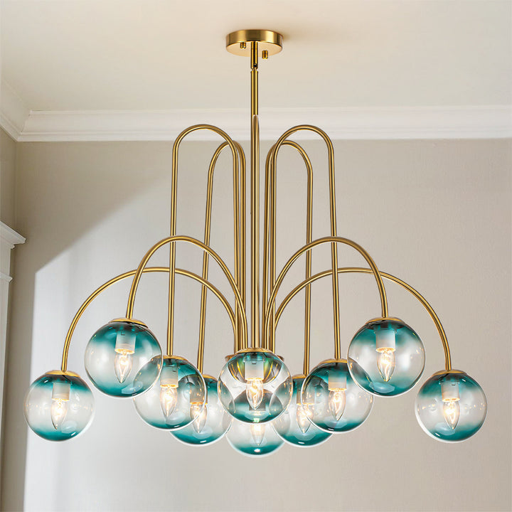 Elevate your interior with this stunning 10-light chandelier featuring whimsical blue gradient glass bubble globes that merge vintage charm with modern elegance. the softly frosted gradient effect casts a calming, atmospheric glow, creating a dreamy focal point in any room. its gracefully tiered silhouette and minimalist lines make it ideal for living rooms, entryways, dining rooms, and bedrooms. compatible with sloped ceilings, this statement piece adds both vertical presence and artistic flair to your space.