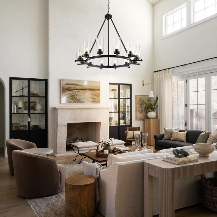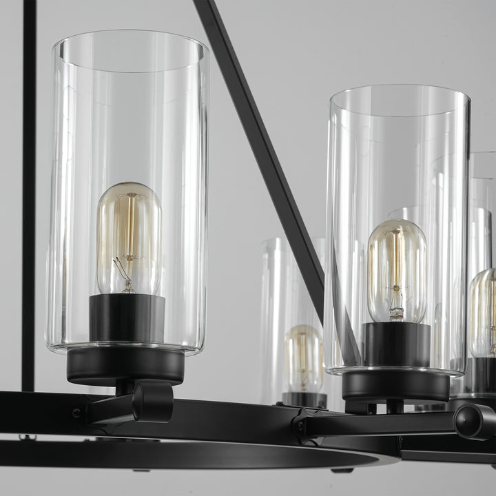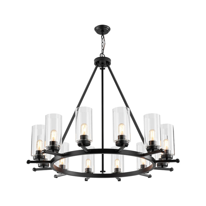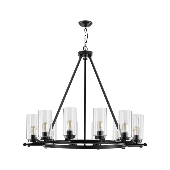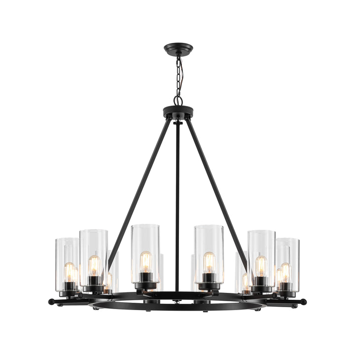 Overlapping arcs form sleek contemporary rings that cradle cylindrical clear glass shades, creating a striking yet refined silhouette. the matte black finish pairs effortlessly with a variety of interiors, while visible black socket covers add a cohesive touch through the transparent glass. ideal for larger living or dining areas, this 12-light chandelier brings bold symmetry and dramatic presence to any space.