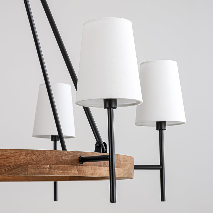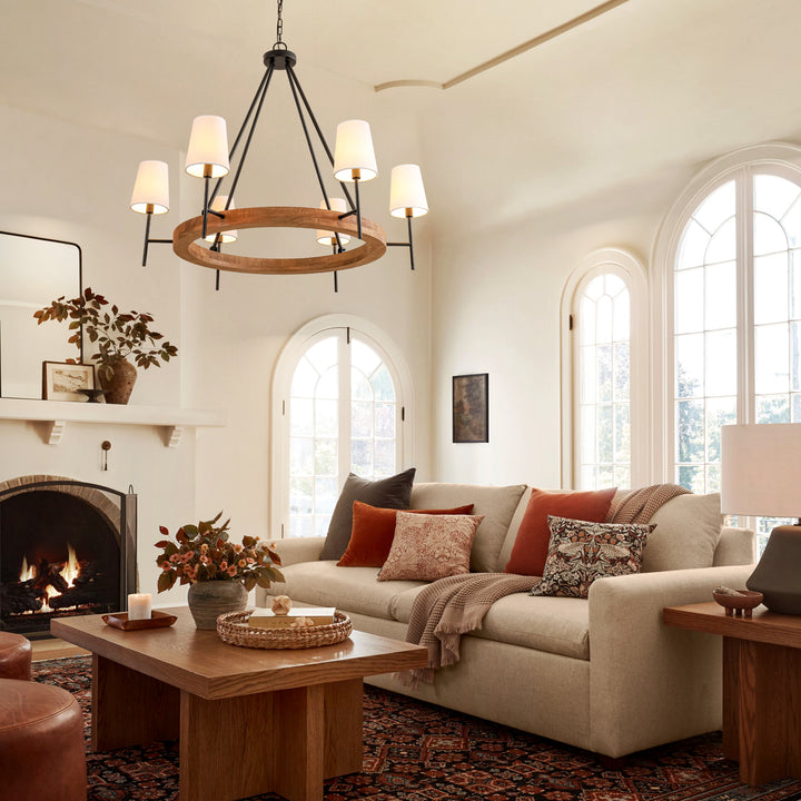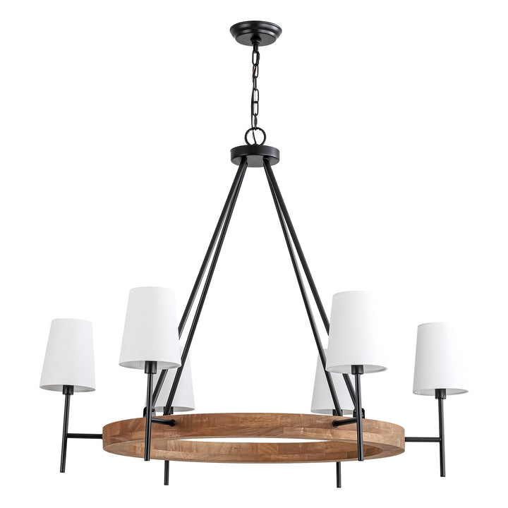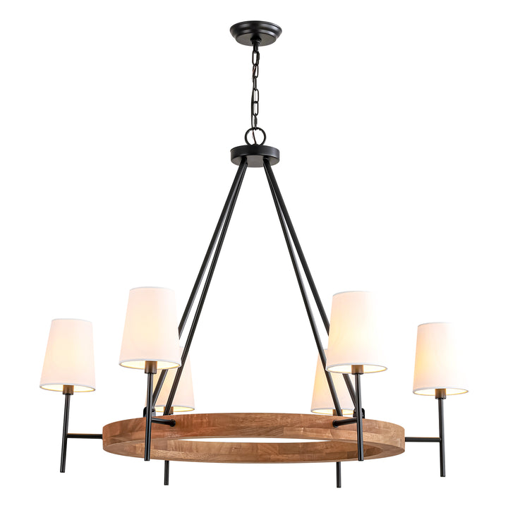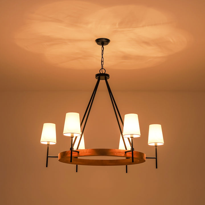 Infuse your home with warmth and character using this 6-light farmhouse chandelier. crafted with a natural solid wood ring and black metal frame, it evokes a rustic yet refined feel, while the soft fabric shades diffuse light gently across the room. Ideal for farmhouse, cottage, or transitional interiors, this chandelier makes a beautiful statement above a kitchen island, dining table, or in a vaulted living room. whether you're hosting a cozy dinner or simply enjoying a quiet evening, it sets the perfect inviting tone. The adjustable 78.74 in. chain offers flexibility for high or sloped ceilings.