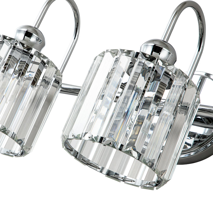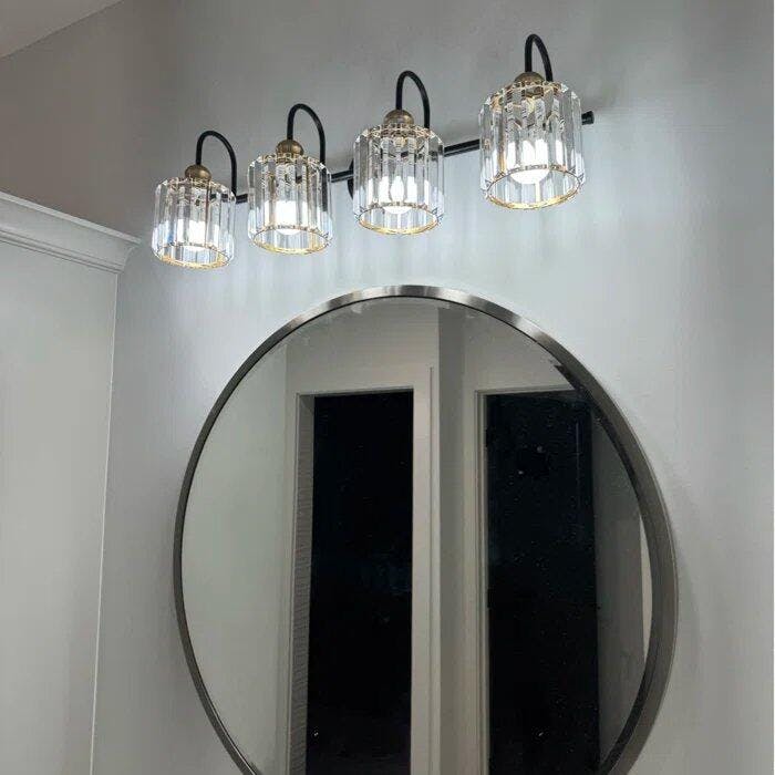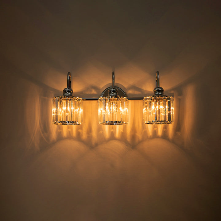 Graceful curves meet radiant clarity in this glam crystal vanity wall sconce, designed to bring timeless refinement to bathrooms, dressing areas, and beyond. the gently arched arms extend from a durable backplate, supporting ceramic E26 sockets and cylindrical crystal shades that softly diffuse the light for a sparkling, layered glow.