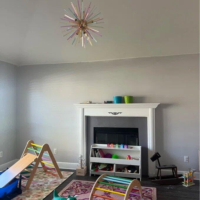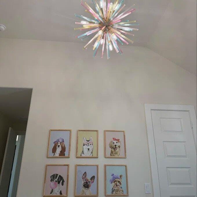 Bring joy and color to your child’s room with this 12-light rainbow sputnik chandelier. bursting with vibrant hues like sunny yellow, sky blue, soft pink, and dreamy purple, this modern starburst design turns into a whimsical rainbow candy when illuminated. its playful firework-inspired shape adds a splash of fun to bedrooms, playrooms, or creative spaces. made from durable metal in a radiant gold finish, this chandelier is not only eye-catching but also dimmable for custom ambiance. add a magical glow to your little one’s world with this dazzling piece of functional art.