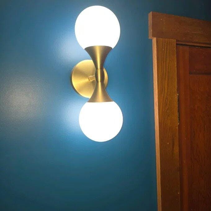 Add a touch of vintage sophistication to your home with this double-ended wall sconce. the sleek, tapered metal body anchors two bold opal matte etched glass shades, evoking the charm of retro dressing rooms and classic photography studios. when lit, the fixture casts a soft, diffused glow—offering even, glare-free illumination that brings warmth and ambiance to hallways, bedrooms, or bathroom vanities. a perfect blend of old-hollywood glamour and modern design, this sconce elevates your space with understated elegance.