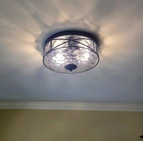 Embrace the effortless charm of coastal living with this 2-light flush mount fixture. a round, close-to-ceiling silhouette is framed by a clean-lined iron cage, offering structure and subtle texture that feels both breezy and grounded. at its center, a rippled glass shade gently softens the glow of two lights within—like sunlight refracted through water—casting a warm, welcoming ambiance across your hallway, kitchen, or bedroom.