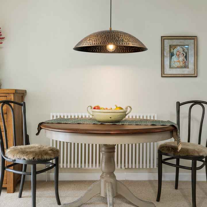 Add vintage charm to your home with this industrial-style pendant light, featuring an antique brass metal shade that delivers both character and function. the wide shallow dome directs focused downward lighting, ideal for kitchen islands, dining spaces, or loft interiors. suspended by an adjustable wire, it fits a variety of ceiling heights with ease. compatible with e26 bulbs, this fixture blends seamlessly with industrial and modern farmhouse decor, offering a timeless lighting solution with practical appeal.