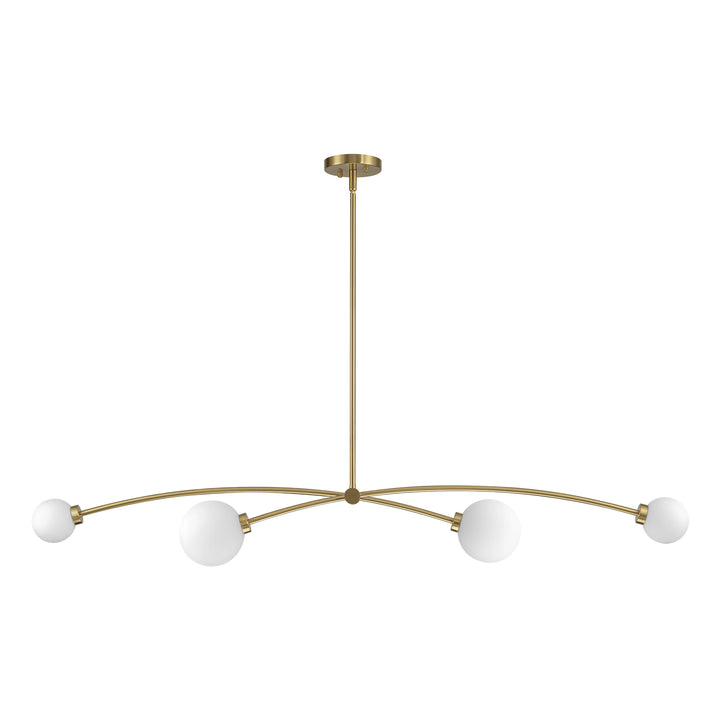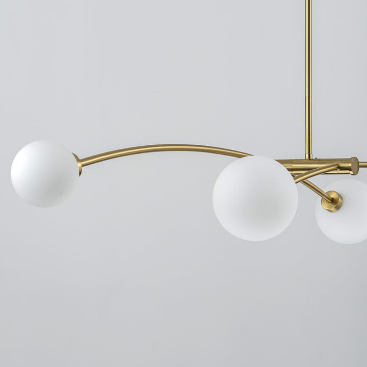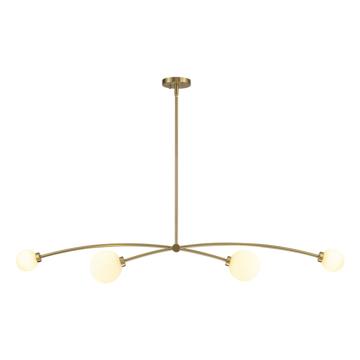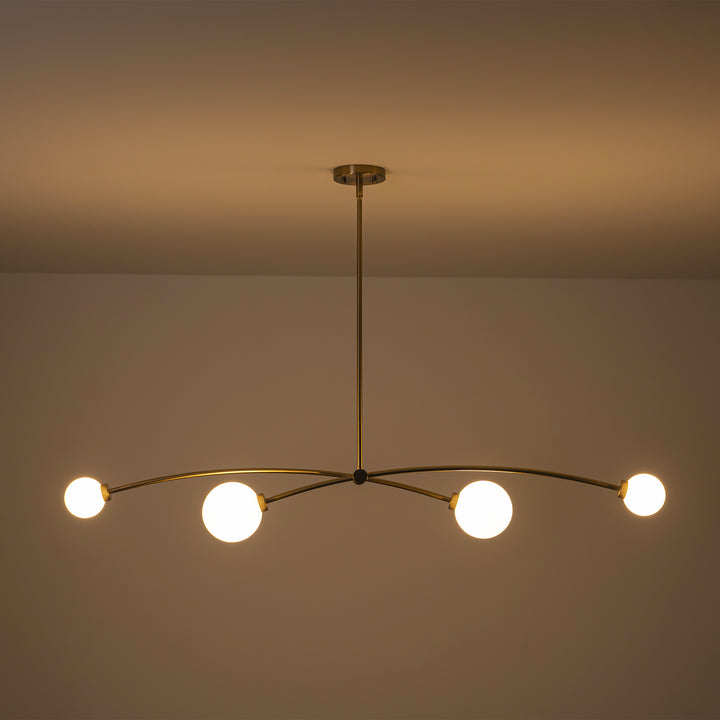 Inspired by modern minimalism and sputnik aesthetics, this 4-light linear pendant features graceful gold arcs paired with soft frosted glass globes. the balanced silhouette brings contemporary elegance to kitchen islands, dining areas, or workspaces. sleek yet eye-catching, it delivers both ambient light and a sculptural design statement.