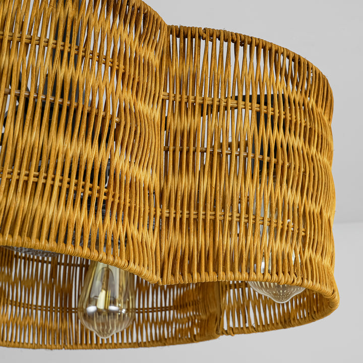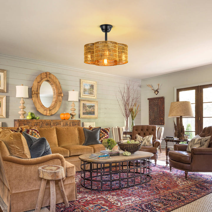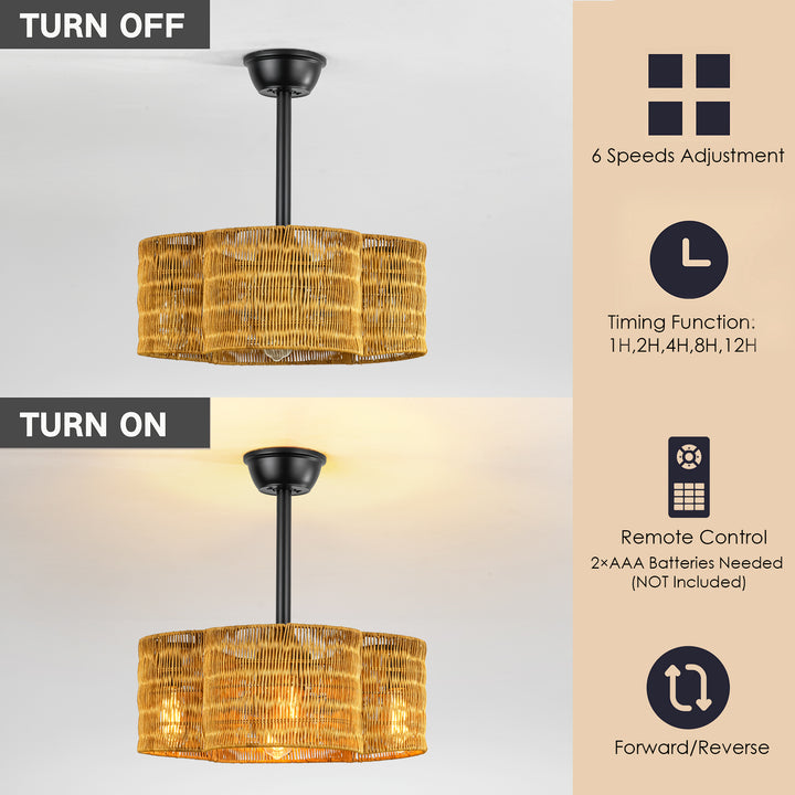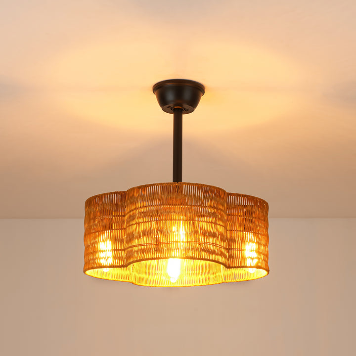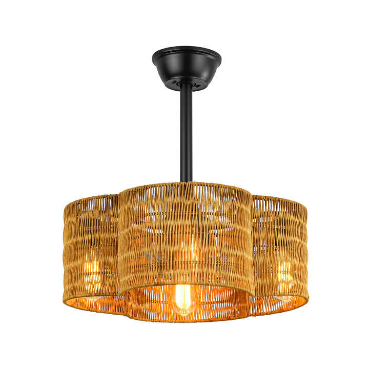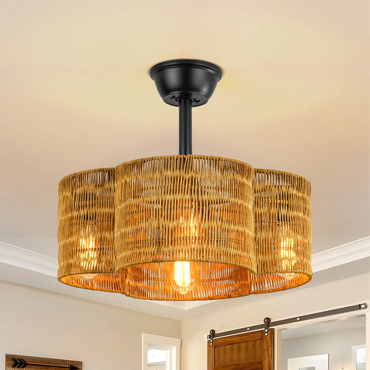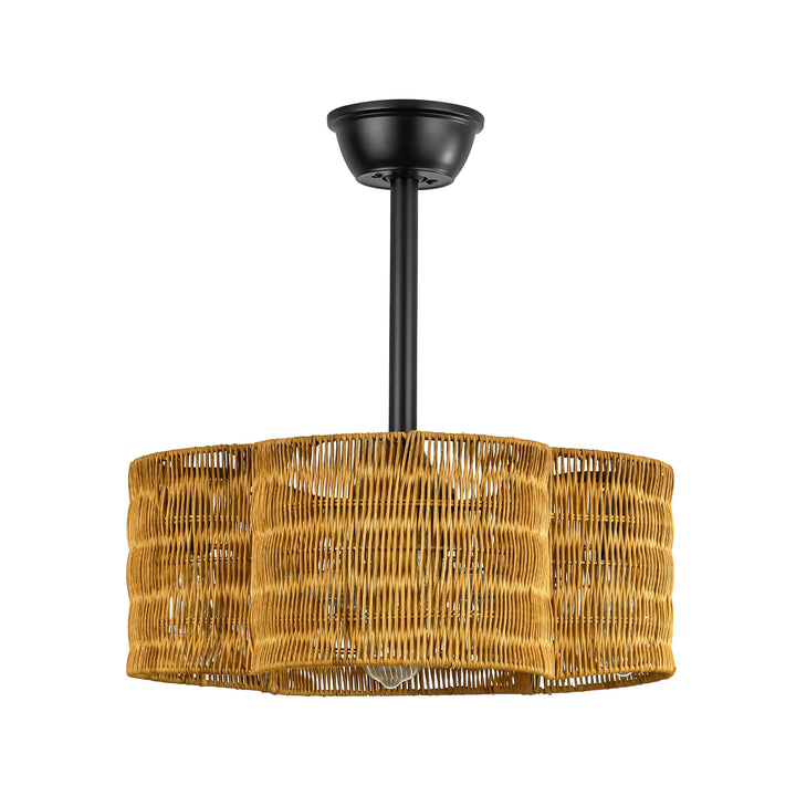 Bring both charm and comfort to your space with this modern farmhouse ceiling fan, featuring a bold mix of matte black, deep brown wood tones, and a geometric rattan drum shade. the natural woven texture adds warmth and organic elegance, while the sleek frame and transparent black blades create a refined, balanced silhouette that suits rustic, transitional, or boho-inspired interiors.