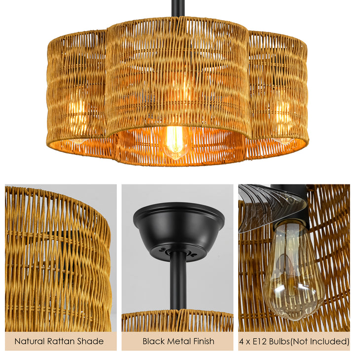 Perfect for living rooms, bedrooms, or covered patios, this fan offers style and functionality in one. the seven-blade design ensures quiet, efficient airflow, and the reversible motor helps maintain the ideal temperature in both summer and winter. four E12 bulbs provide ambient lighting (bulbs not included), and the included remote control lets you adjust speed and light levels effortlessly. whether you're creating a cozy retreat or updating a modern farmhouse, this fan delivers year-round comfort with timeless appeal.
