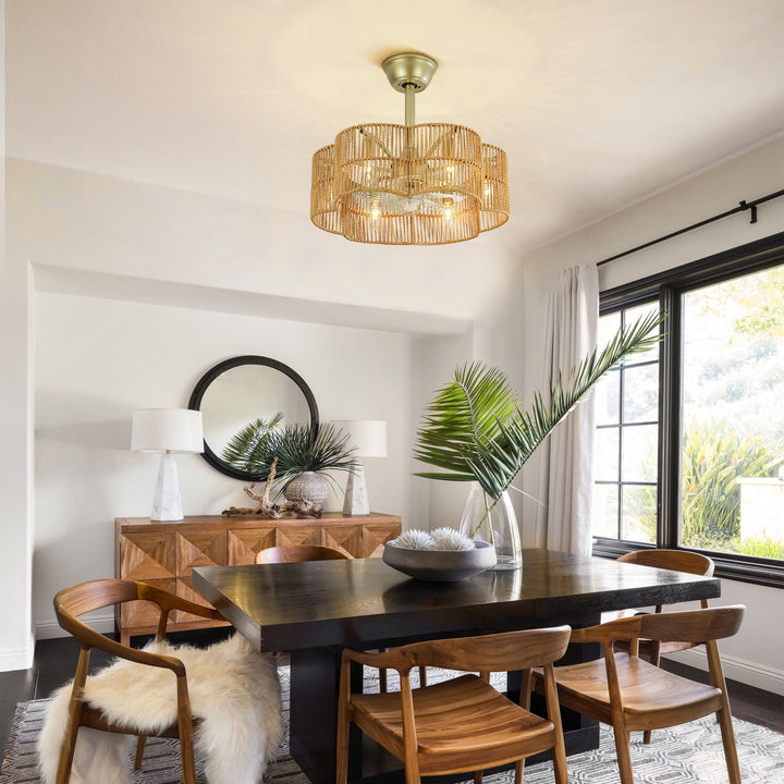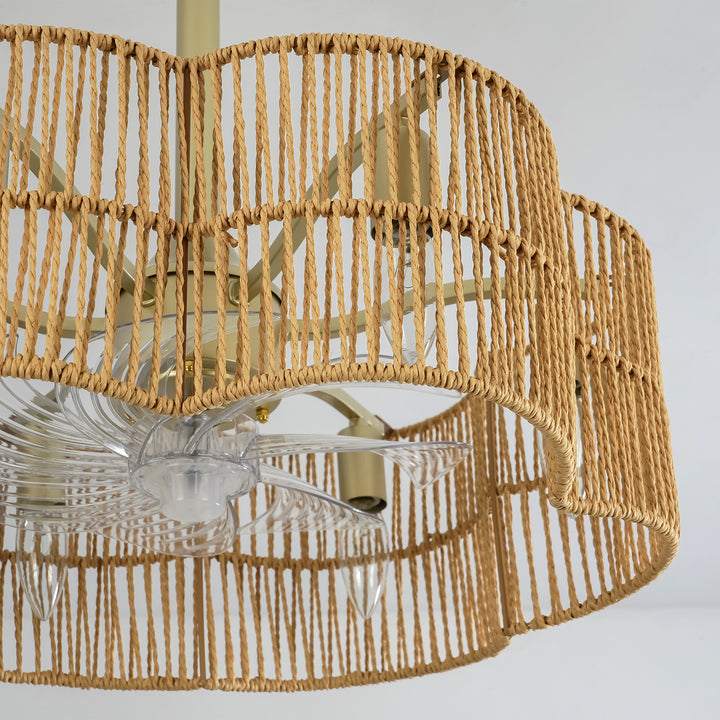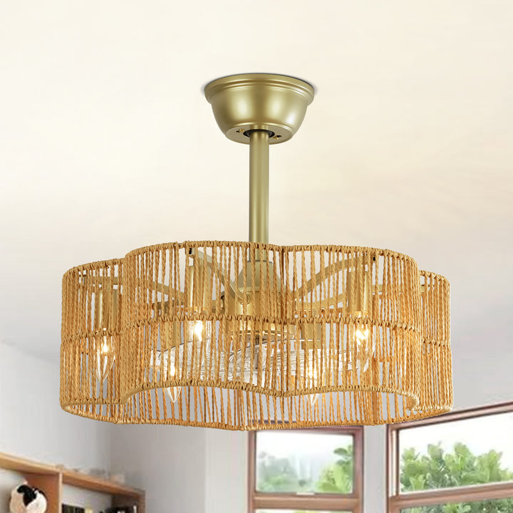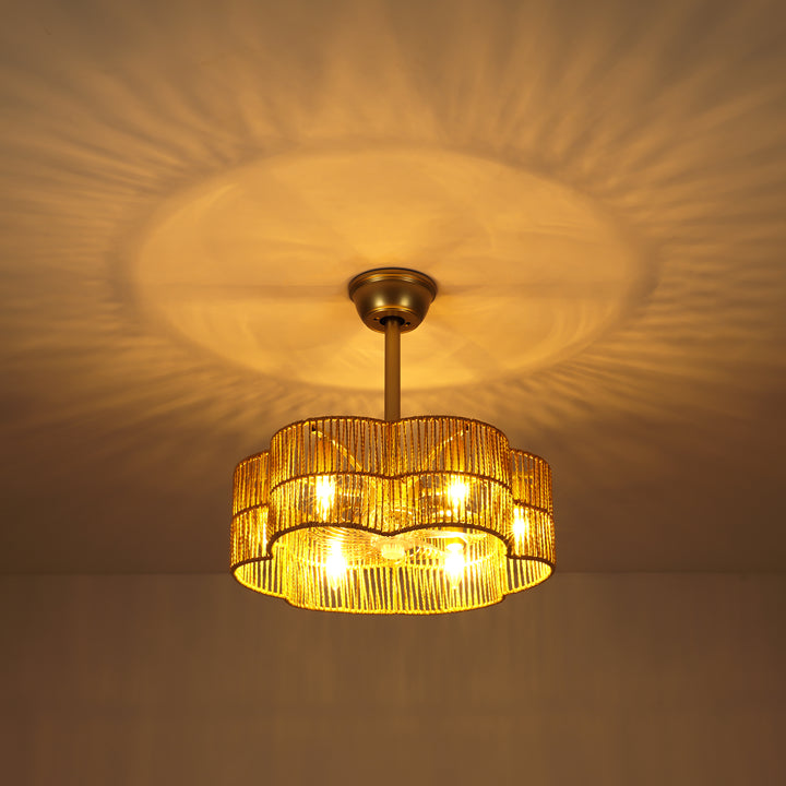 Bring breezy boho style to your home with this 6-light ceiling fan that blends natural textures with practical comfort. the handcrafted geometric drum shade is woven from natural rope, adding a warm, organic feel to your space while the sleek matte black frame creates a touch of contrast and modern balance. seven transparent blades circulate air quietly and efficiently, making this fan a beautiful and functional addition to bohemian, coastal, or rustic interiors.