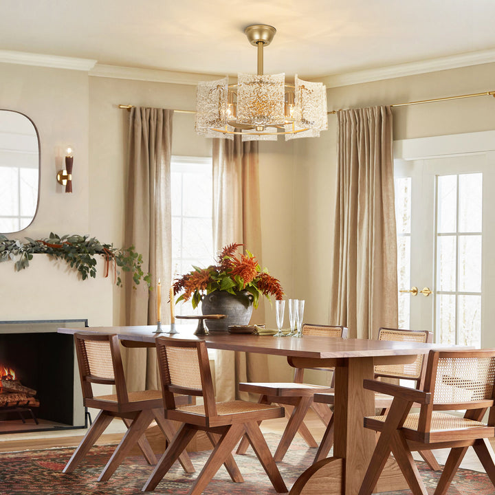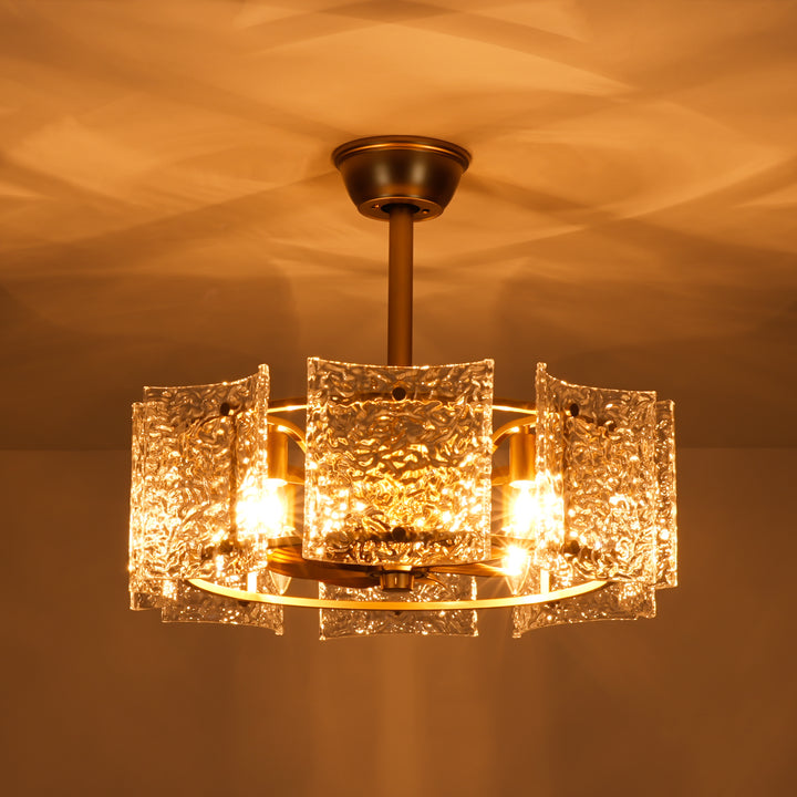 Elevate your space with a refined blend of artistry and functionality in this clear rippled glass ceiling fan light. featuring eight handblown curved water-ripple glass panels, this fixture casts soft, shimmering light patterns that bring an ethereal feel to any room. the minimalist silhouette, paired with its sculptural glass, makes it a stunning centerpiece for bedrooms, dining areas, or modern living rooms.