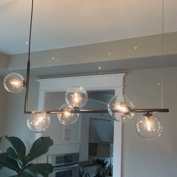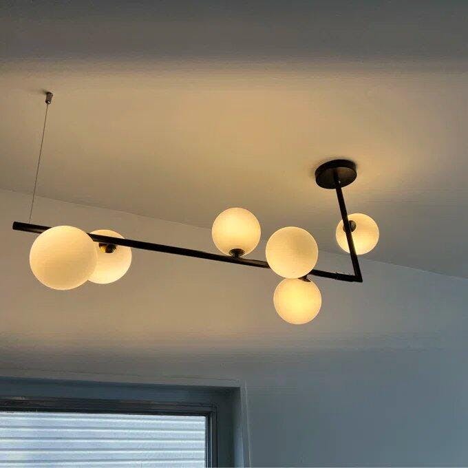 Illuminate your kitchen or living space with this modern 6-light pendant, where playful bubble-shaped glass shades meet a sleek, angled metallic frame for a stylish, mid-century look. designed for both beauty and function, its minimalist silhouette offers a refined yet fun twist on contemporary lighting. the adjustable suspension and sloped ceiling compatibility make installation seamless, while dimmable functionality allows you to customize your ambiance with ease.