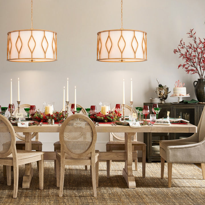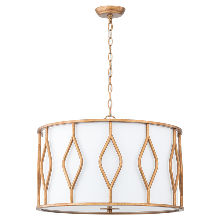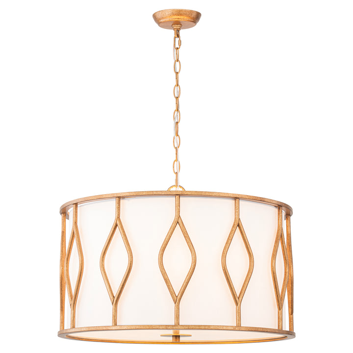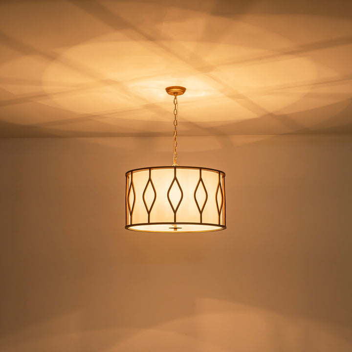 Add a touch of luxury to your interior with this statement-making pendant light. featuring curved open columns that elegantly frame a fabric shade, this fixture blends classic form with modern sophistication. a white glass diffuser softens the light, casting a warm, ambient glow throughout the room. finished in a handcrafted mystic luster, it brings subtle shimmer and texture to any setting. perfect for dining areas, living rooms, or entryways, this pendant adds both elegance and atmosphere to your space.