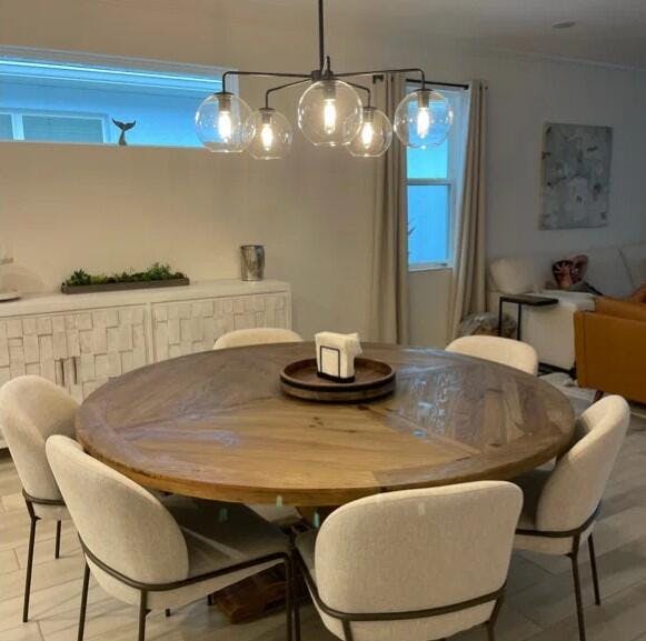 Each clear glass globe shade houses an exposed bulb (bulb not included), adding a touch of vintage charm and a modern edge to your interior. the dimmable feature allows you to easily set the perfect ambiance, from bright task lighting to a soft, inviting glow for intimate gatherings. elevate your living room or dining area with this statement piece, combining bold design and practical lighting for everyday use or special occasions.