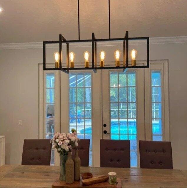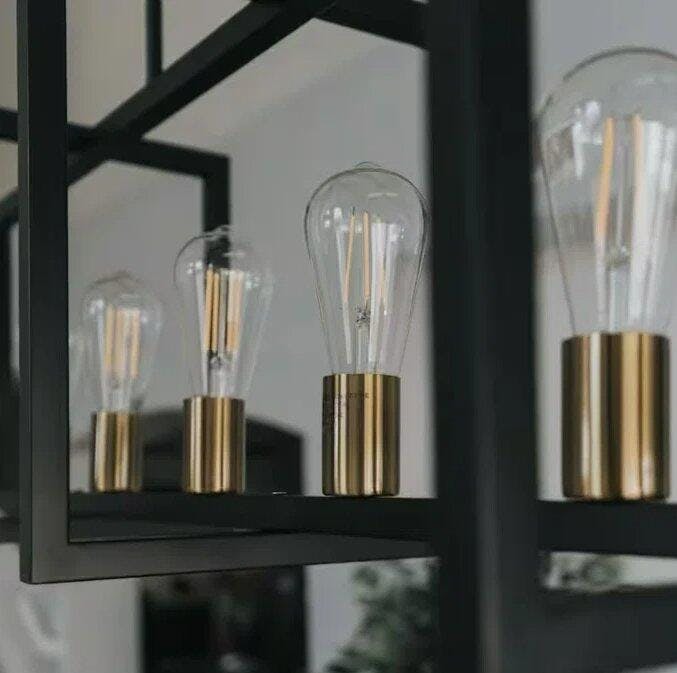 Illuminate your kitchen with modern sophistication using this 6-light linear chandelier. featuring an open geometric frame in a matte black finish, this fixture adds architectural interest while providing ample ambient lighting. the exposed bulb design brings a contemporary edge, ideal for those who appreciate clean lines and minimalist charm. whether suspended over a kitchen island, a dining table, or even a long hallway, its adjustable height allows you to tailor the look and feel to fit your space perfectly. pair it with dimmable bulbs to create the perfect ambiance—bright for morning coffee prep, soft and cozy for evening dinners. this versatile piece doesn’t just light your room—it defines it.