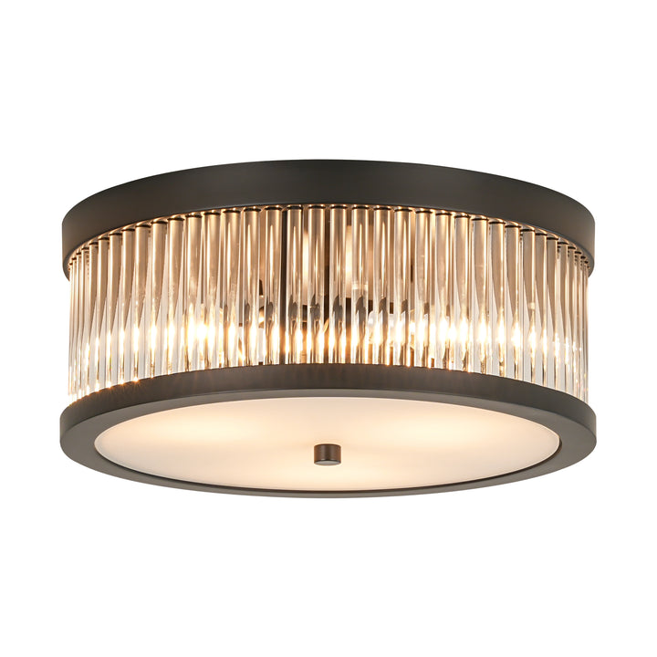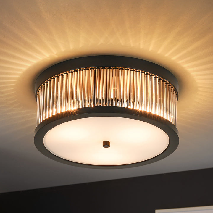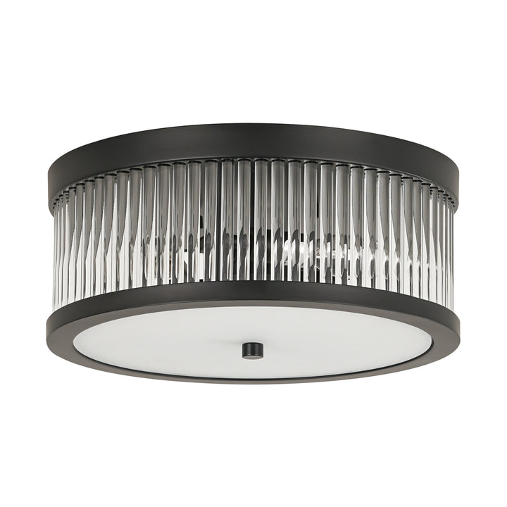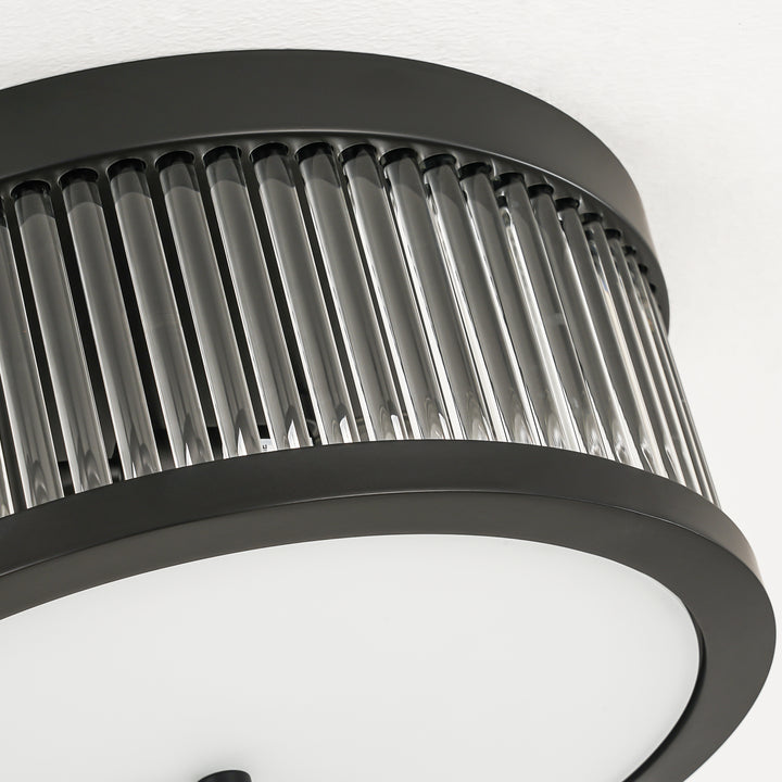 Bring sculptural texture and industrial refinement to your ceiling with this 3-light flush mount. the round silhouette features a layered composition of slender clear glass rods arranged in a radial pattern, anchored by a matte black metal frame for a bold yet balanced presence. the double-treated flat glass diffuser—printed on one side and sandblasted on the other—softens the glow while adding visual depth.
